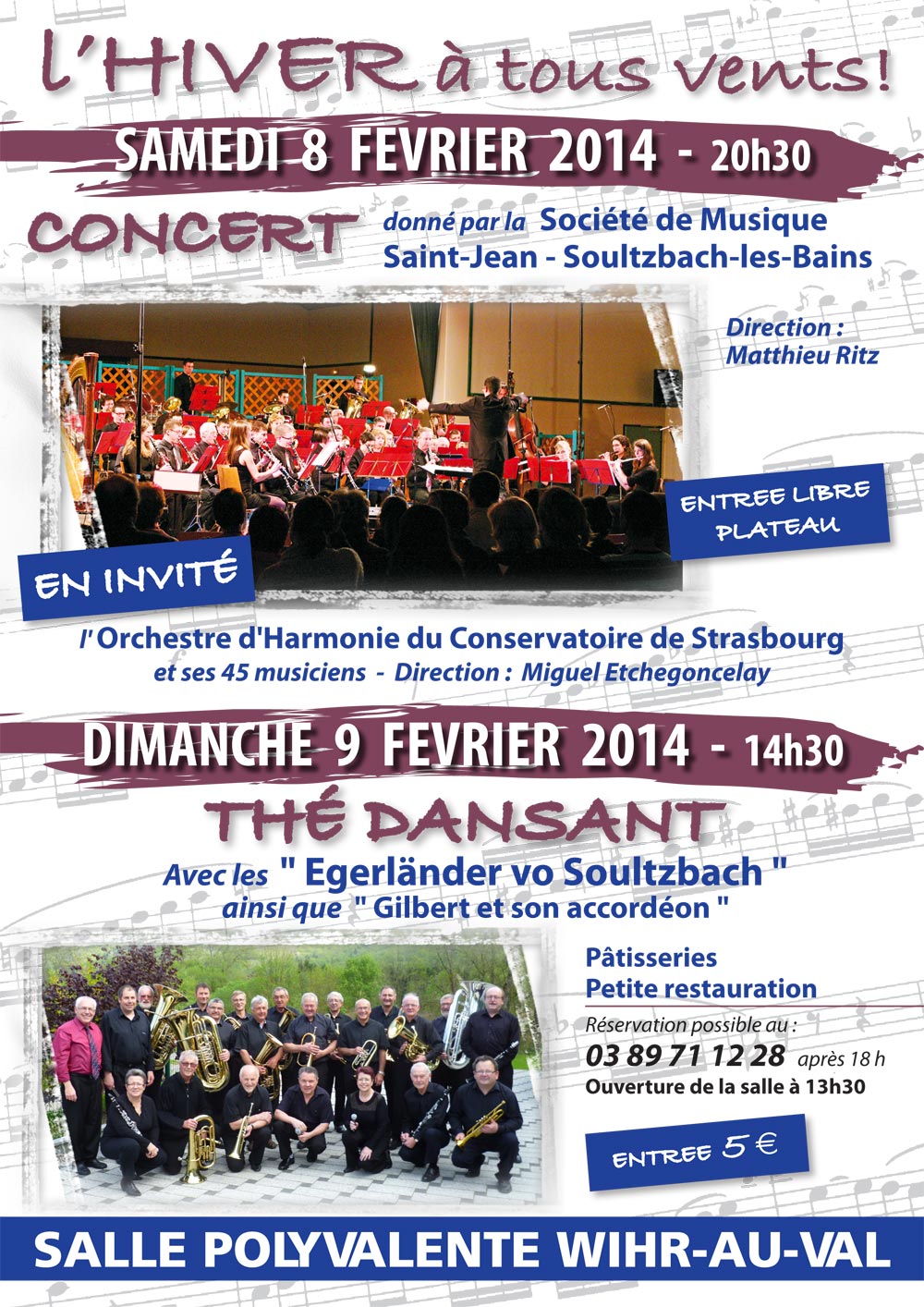 Les musiciens de la Société de Musique St-Jean de Soultzbach-les-Bains ont le plaisir de vous inviter à leur CONCERT « L’Hiver à tous vents » qui aura lieu le samedi 8 février 2014 à 20 H 30 dans la Salle Polyvalente de Wihr-au-Val.